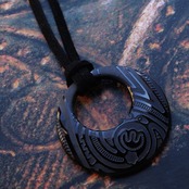 深く艶やかな漆黒のオニキスに、山梨県の釈迦堂遺跡博物館の深鉢土器の手形文様を彫り込んだリングペンダントです。