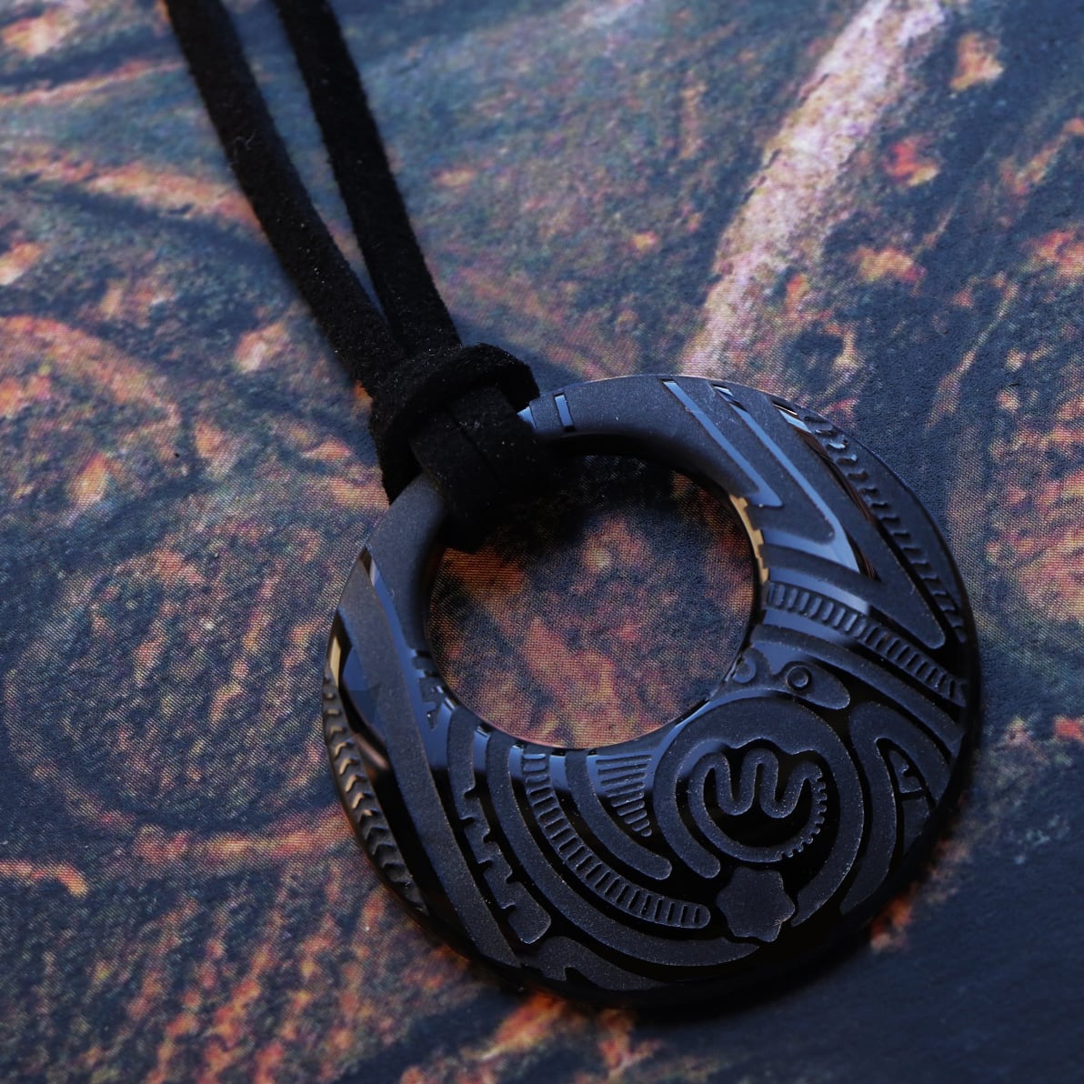 ペンダントの表側に精緻に彫刻された神秘的な手形文は、オニキスのマットな質感と光沢のコントラストによって力強く浮かび上がります。