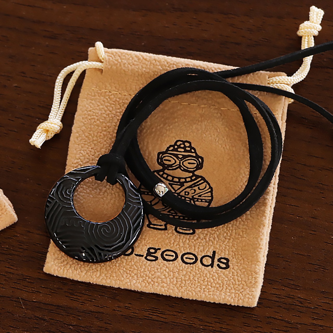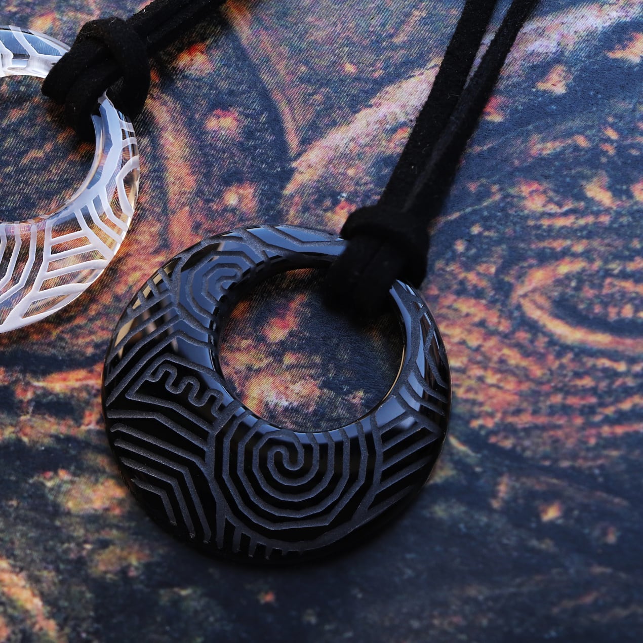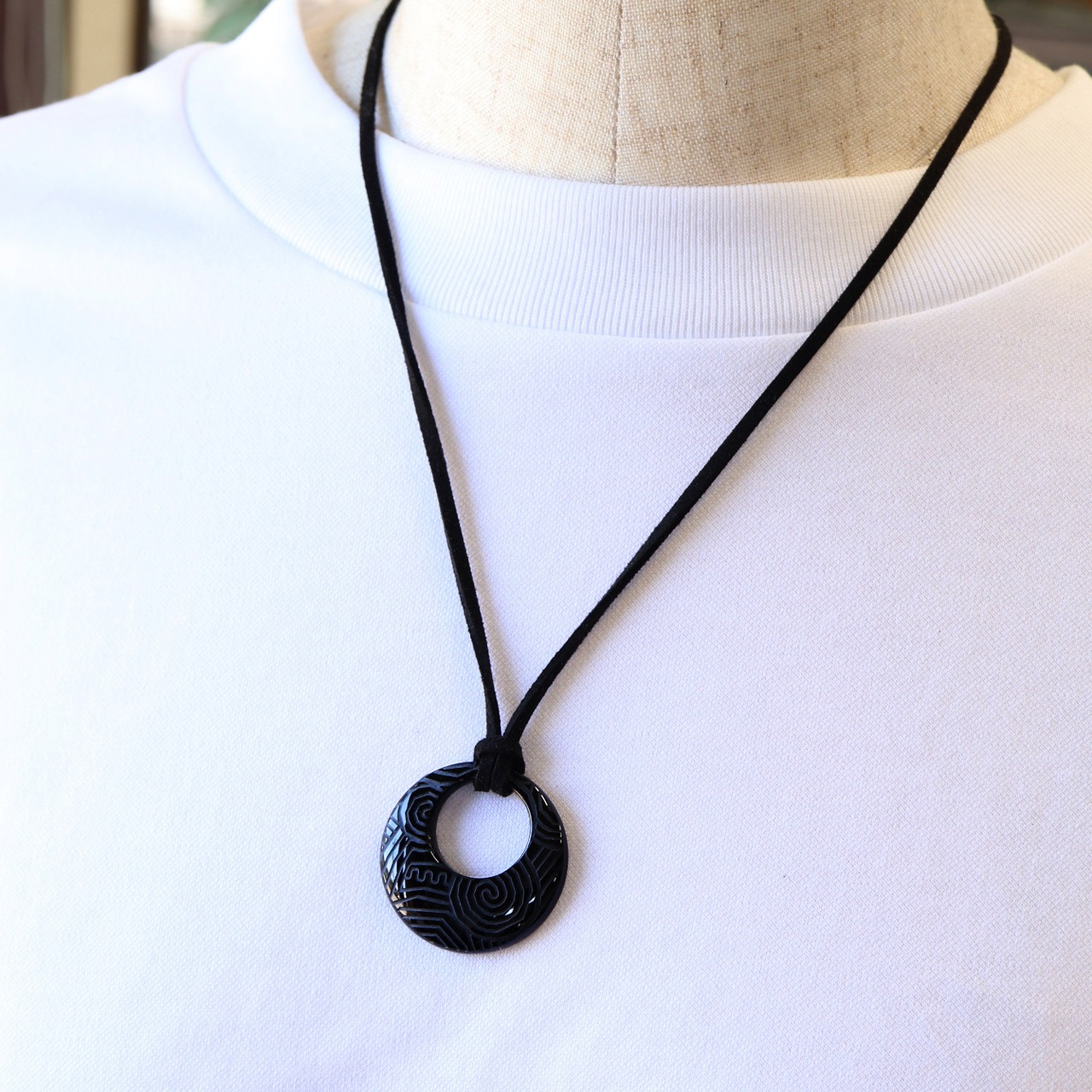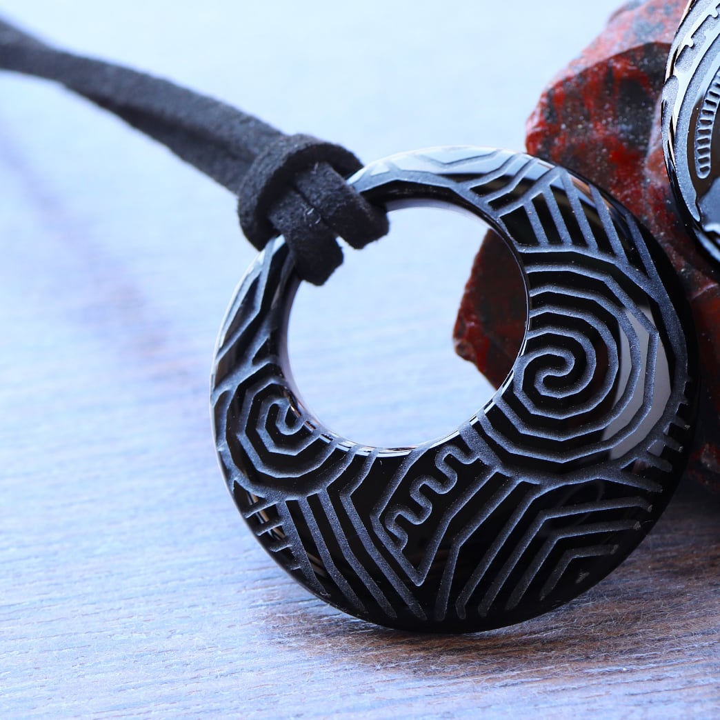 ペンダントの表側に精緻に彫刻された迷路のような渦巻文は、オニキスのマットな質感と光沢のコントラストによって力強く浮かび上がります。