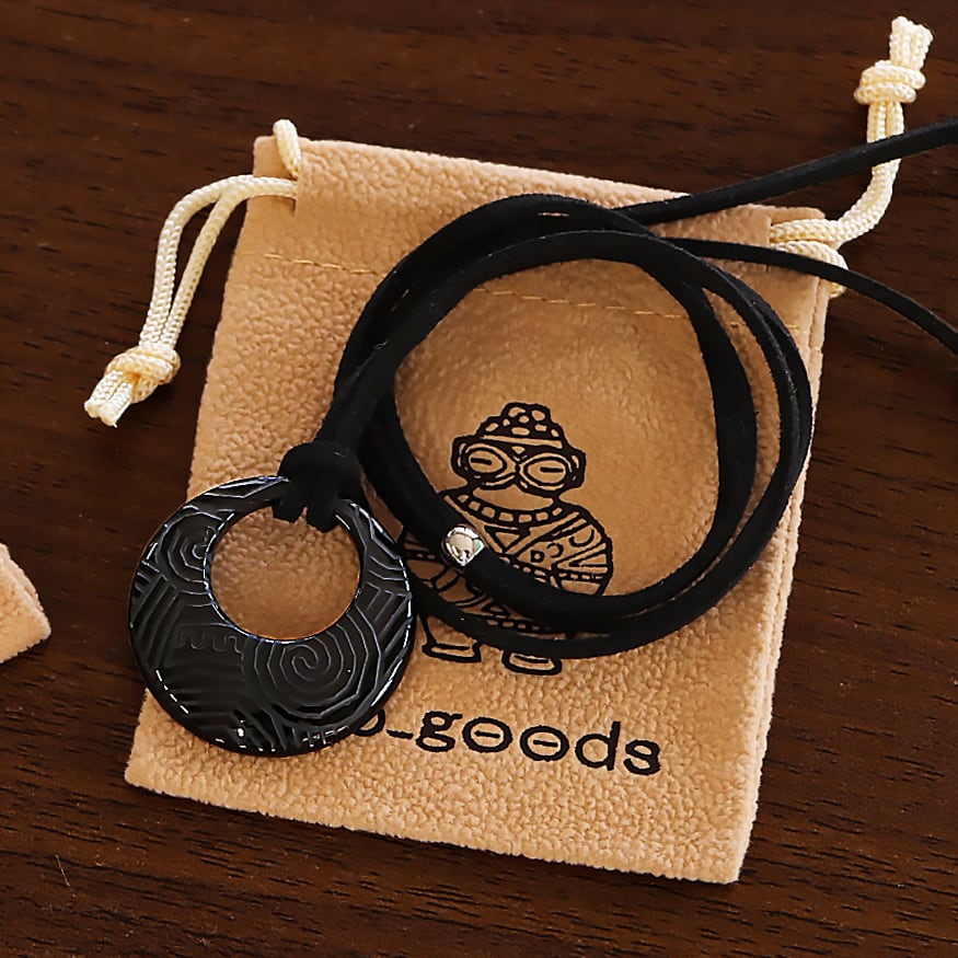 深く艶やかな漆黒のオニキスに、山梨県立博物館に展示されている**「渦巻文土器」**の文様を彫り込んだリングペンダントです。この土器は山梨県指定文化財にも指定された、壮大な縄文アートです。