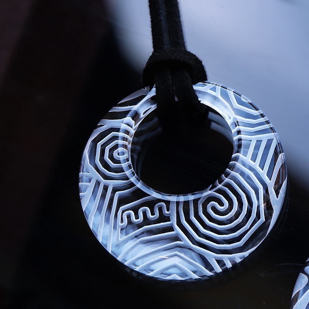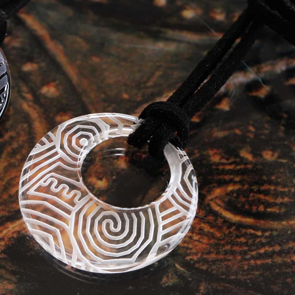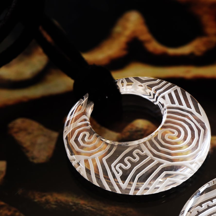 その神秘的な文様を、清らかな人工水晶の裏側に精緻に刻み込みました。光を透過する水晶ならではの繊細かつ幻想的な陰影を、胸元でお楽しみいただけます。