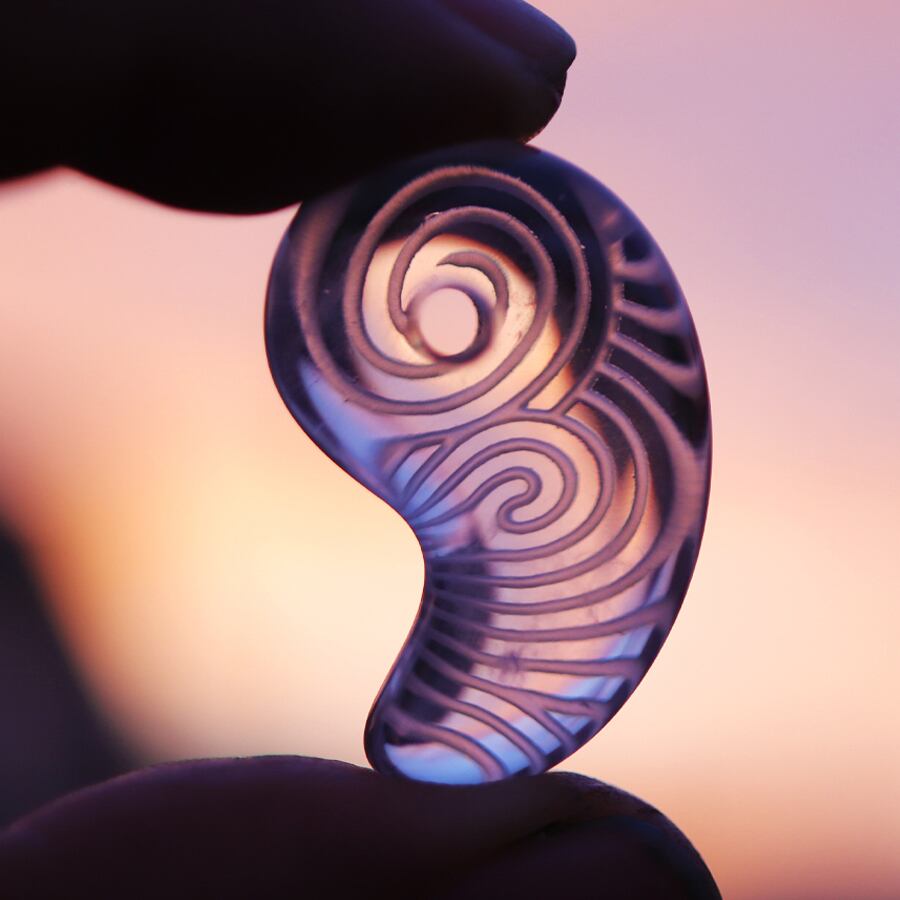 水晶の勾玉に、縄文土器の伝統的な文様を繊細に彫刻したアミュレット(お守り)です。
