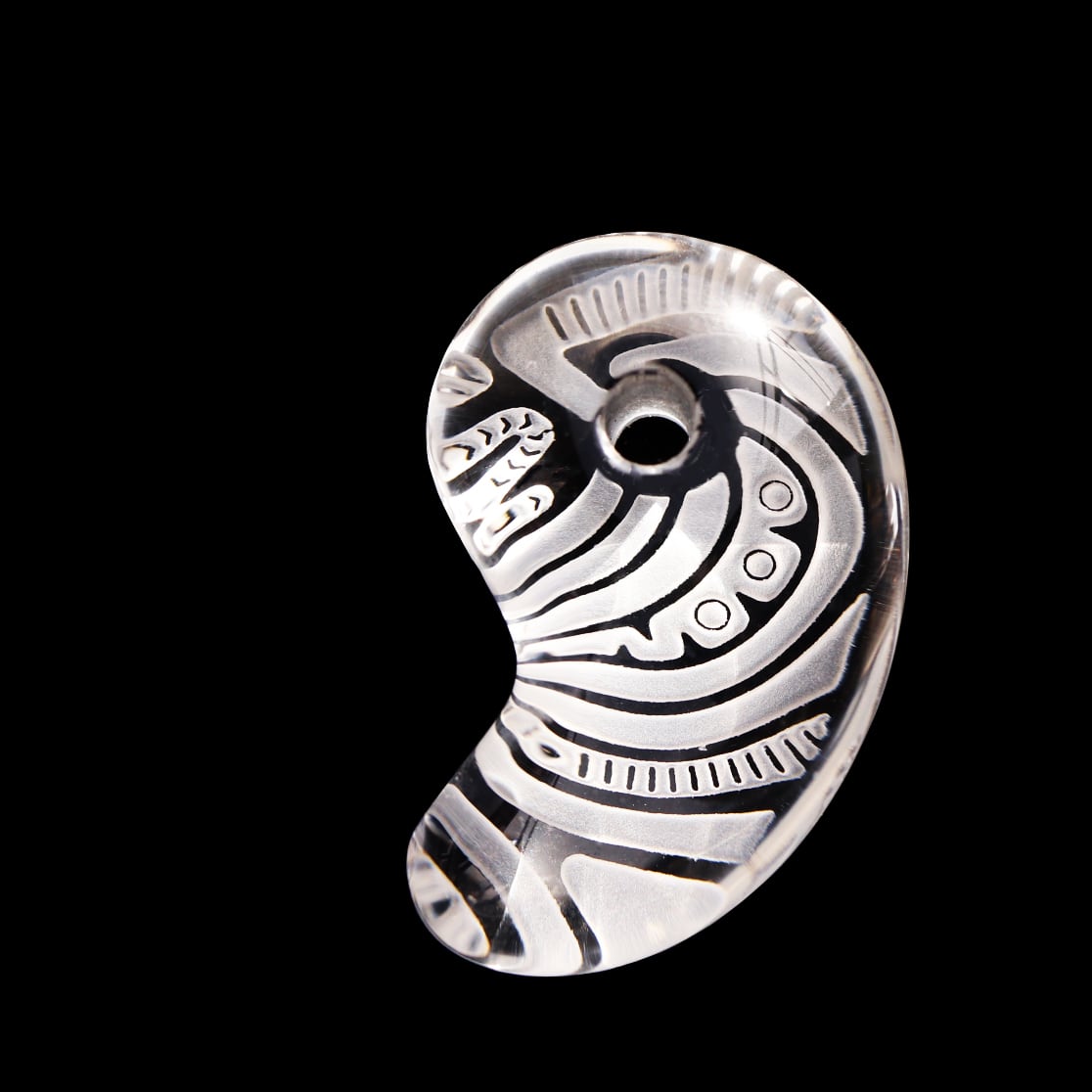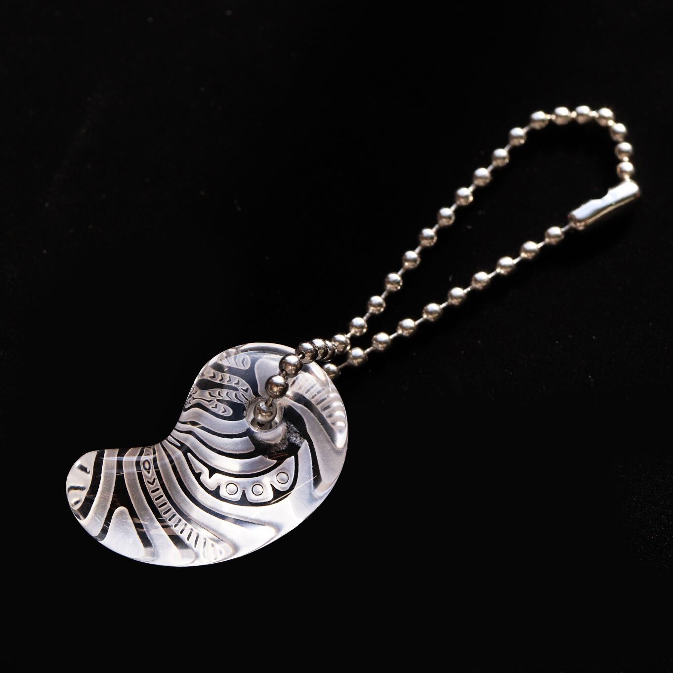 水晶の勾玉に、縄文土器の伝統的な文様を繊細に彫刻したアミュレット(お守り)です。