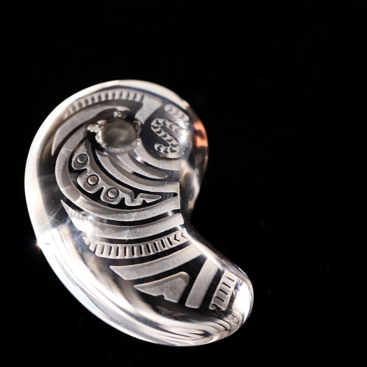 本品は、繊細な縄文文様を美しく鮮明に表現することを最優先しております。天然水晶特有の内包物やクラック(ひび)による文様の乱れを防ぐため、あえて不純物のない高品位な人工水晶を選定して使用しています。