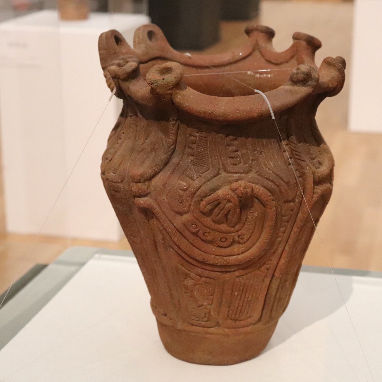 この文様は、土器の裏側に描かれた神像の足元を切り取ったものです。人が大地の上で踊っているかのようなその姿は、揺るぎない安定と祖先からの力強い守護を感じます。