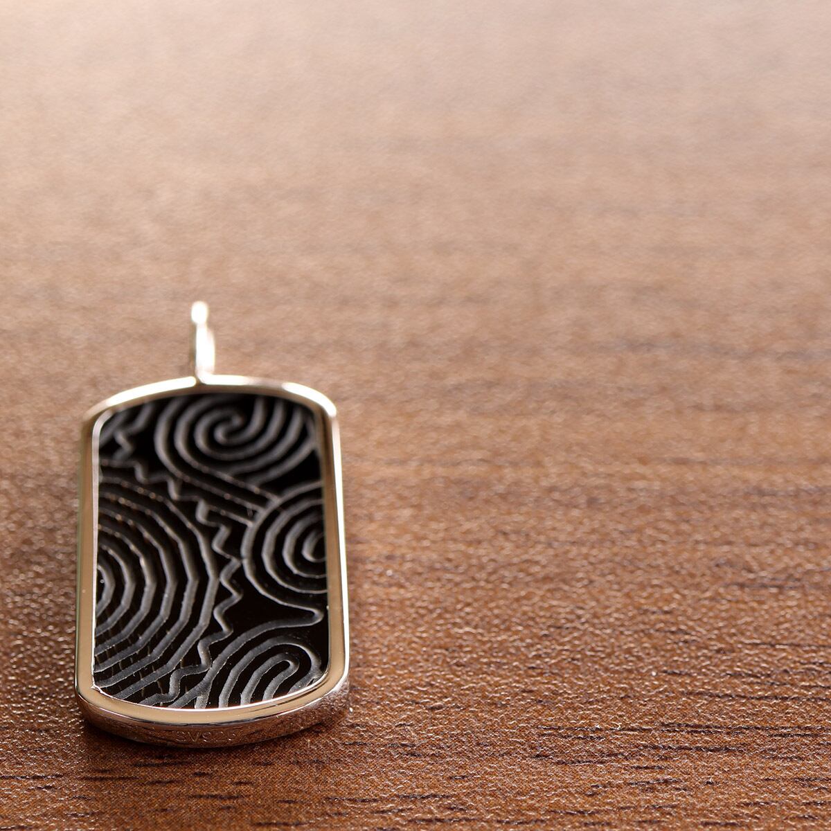 オニキスのプレートに縄文土器の文様を彫刻したペンダントです。