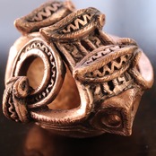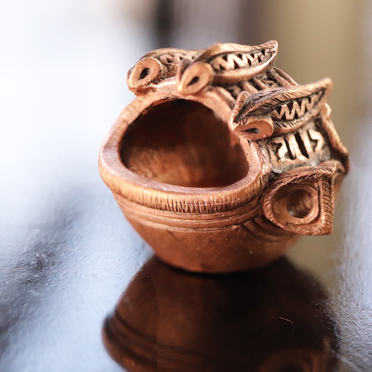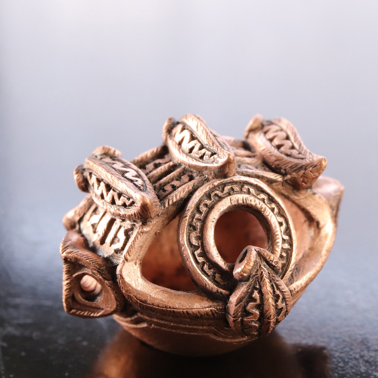 ツチノコがちょこんと乗った 縄文の釣手土器のミニオブジェ (659-722)